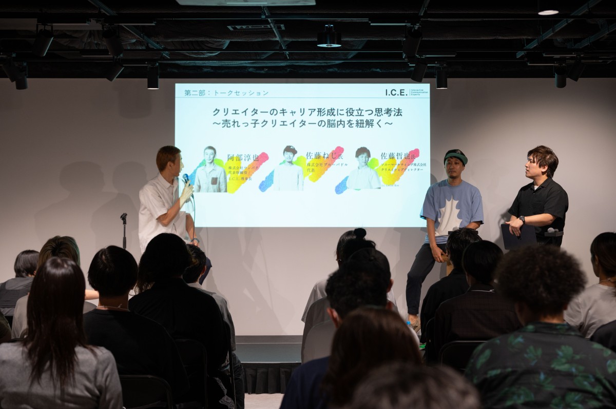 登壇したのは、株式会社ブルーパドル 代表の佐藤ねじ氏、ソニーマーケティング株式会社 クリエイティブディレクターの佐藤哲也氏 。モデレーターはI.C.E.の阿部淳也理事長(株式会社ワンパク代表取締役社長 )が務めました。