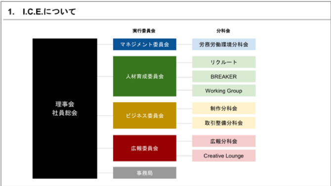 I.C.E.はマネジメント、人材育成、ビジネス、広報の4つの委員会があり、その配下にそれぞれ分科会で成り立っています。