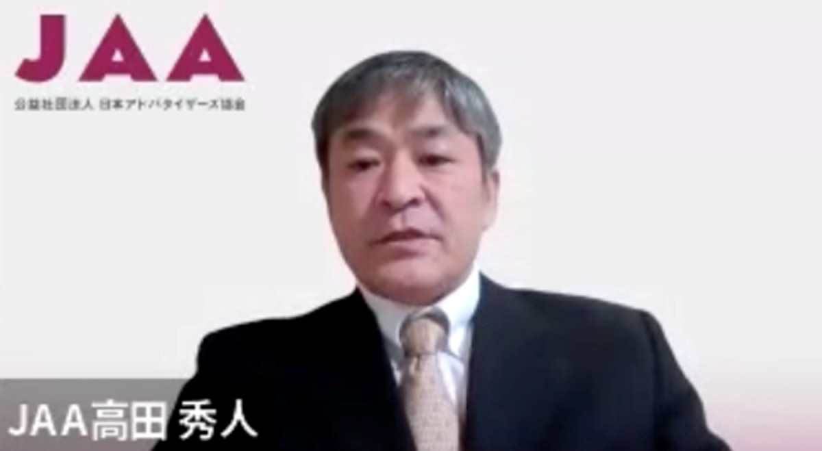 JAAA制作取引委員会の立場から岡野敏之氏(電通/日本広告業協会)より、本ハンドブックの背景/主な変更点/制作ガイドラインの目標/取引における注意点/制作環境の改善に向けて/その他留意点/広告主・広告会社・制作会社に求められる役割が解説されました。