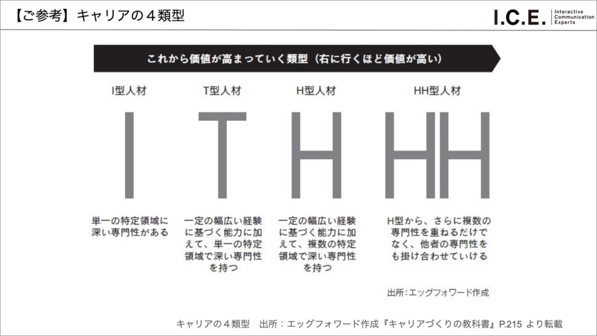 人材開発会社のエッグフォワード社が作成したこの人材モデルは、個人の専門性と経験の幅広さに着目したものです。I型人材(単一の職種で深い専門性をもつ)、T型人材(特定領域で深い専門性と経験に基づく幅広い周辺知識をもつ)、H型人材(複数の特定領域で深い専門性をもつ)、HH型人材(Hが複数ブリッジし他者を巻き込む)の4種類があり、右に行くほどキャリアの市場価値が高いと言われているそうです。